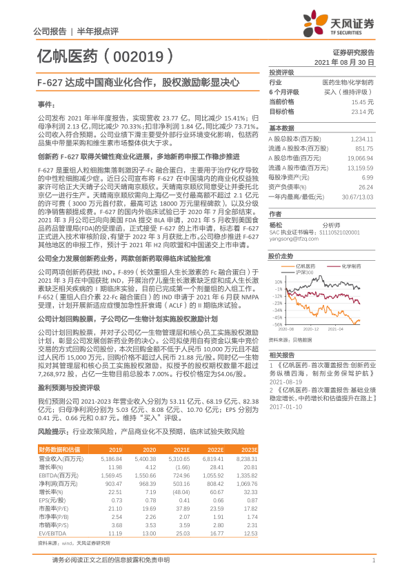 亿帆医药2021年上半年业绩受到外部环境影响有所下滑,但公司在创新药业务上取得了显著进展,F-627商业化合作顺利推进,其他创新药研发也在稳步进行中。同时,公司通过股权激励和股票回购计划,进一步激发了内部活力,彰显了对未来发展的信心。维持“买入”评级。