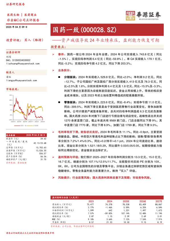 零售板块:2024年实现收入223.6亿元,同比-8.4%;实现净亏损11.0亿元,同比-309.5%。利润下滑主要是由于受到医药零售行业政策变化、竞争加剧等影响,公司计提资产减值准备所致,总共对归母净利润造成6.3亿元的负面影响。国大药房2024年对旗下门店进行亏损治理与闭店优化,战略性退出并关闭1270余家直营门店,截止年底共有9569家门店,门店总数同比下滑9%。其中直营门店7770家,同比下滑8.9%,加盟门店1799家,同比下滑9.5%。
