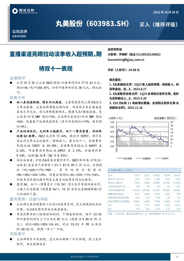 本报告全面分析了丸美股份2023年第三季度的业绩表现及经营策略。公司在第三季度实现了营收和净利润的显著增长,主要得益于成功的线上渠道拓展、大单品策略以及高毛利产品占比的提升。尽管短期内为“双十一”前置的费用投入对利润率构成一定压力,但公司通过优化产品结构和聚焦核心品类,展现出强劲的盈利能力和增长潜力。展望未来,公司将继续深化品牌策略,提升电商运营效率。尽管盈利预测有所下调,但市场对其长期发展仍持“买入”评级,同时需关注品牌增长、新品牌推广及线上竞争等潜在风险。