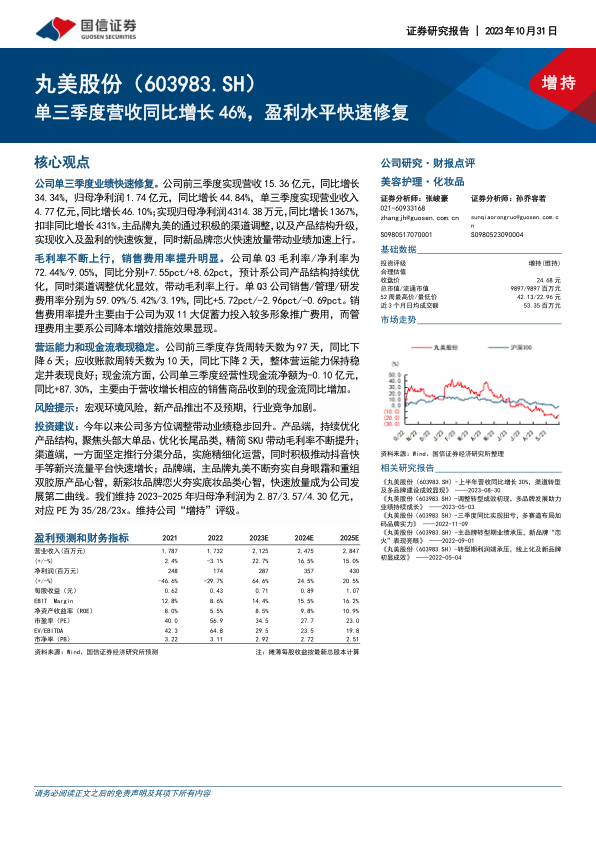 投资建议:今年以来公司多方位调整带动业绩稳步回升。产品端,持续优化产品结构,聚焦头部大单品、优化长尾品类,精简SKU带动毛利率不断提升;渠道端,一方面坚定推行分渠分品,实施精细化运营,同时积极推动抖音快手等新兴流量平台快速增长;品牌端,主品牌丸美不断夯实自身眼霜和重组双胶原产品心智,新彩妆品牌恋火夯实底妆品类心智,快速放量成为公司发展第二曲线。我们维持2023-2025年归母净利润为2.87/3.57/4.30亿元,对应PE为35/28/23x。维持公司“增持”评级。