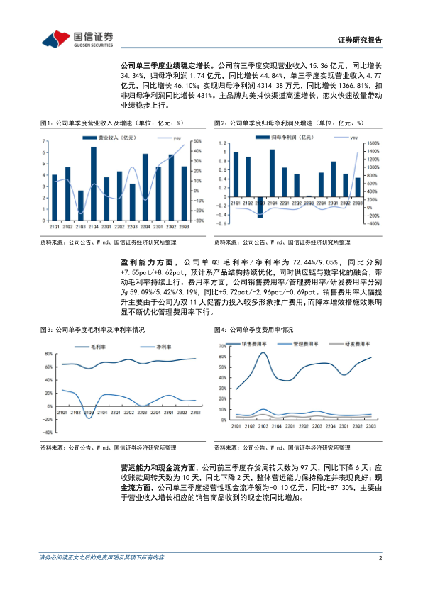 公司单三季度业绩快速修复。公司前三季度实现营收15.36亿元,同比增长34.34%,归母净利润1.74亿元,同比增长44.84%,单三季度实现营业收入4.77亿元,同比增长46.10%;实现归母净利润4314.38万元,同比增长1367%,扣非同比增长431%。主品牌丸美的通过积极的渠道调整,以及产品结构升级,实现收入及盈利的快速恢复,同时新品牌恋火快速放量带动业绩加速上行。