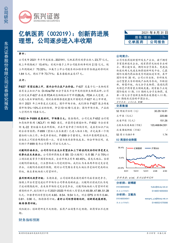 盈利预测及投资评级: 长期来看,公司创新药在国内国外均具有强竞争力,陆续上市后有望迅速打开市场为公司带来高额收益;泛酸钙目前我们认为处于波动周期底部,在未来市场经过充分竞争后,泛酸钙板块收入有望回升到理想的水平。我们预计公司 2021-2023 年的收入有望达到 45.59、47.89、51.28亿元、归母净利润有望达到 4.60、 8.54、 9.54 亿元,对应 EPS 分别为 0.44、0.81、 0.90 元,维持推荐评级。 看好公司经营持续向好,创新药进展理想,维持推荐评级。