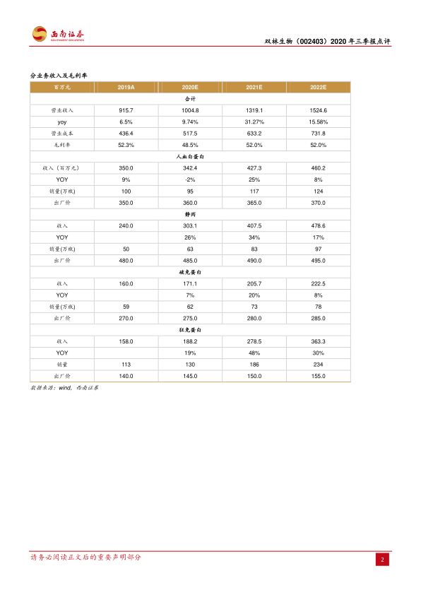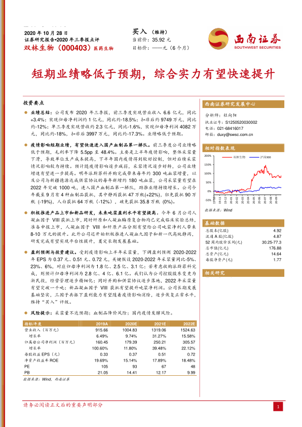 双林生物在2020年前三季度面临疫情带来的短期业绩压力,但公司通过一系列战略举措,展现出强大的长期增长潜力。采浆量的显著提升(通过并购和供浆协议)将使其在2022年进入国产血制品第一梯队。同时,高附加值新产品的研发和上市(如人凝血因子VIII、纤原等)将有效提升吨浆盈利水平。在控股股东浙民投的精细化管理下,公司经营效率和财务结构持续优化。尽管短期盈利预测有所下调,但基于采浆量增长、新品上市和管理改善的“三因子共振”,公司长期发展基础坚实,盈利能力有望逐步恢复并实现持续增长。因此,报告维持对双林生物的“买入”评级。