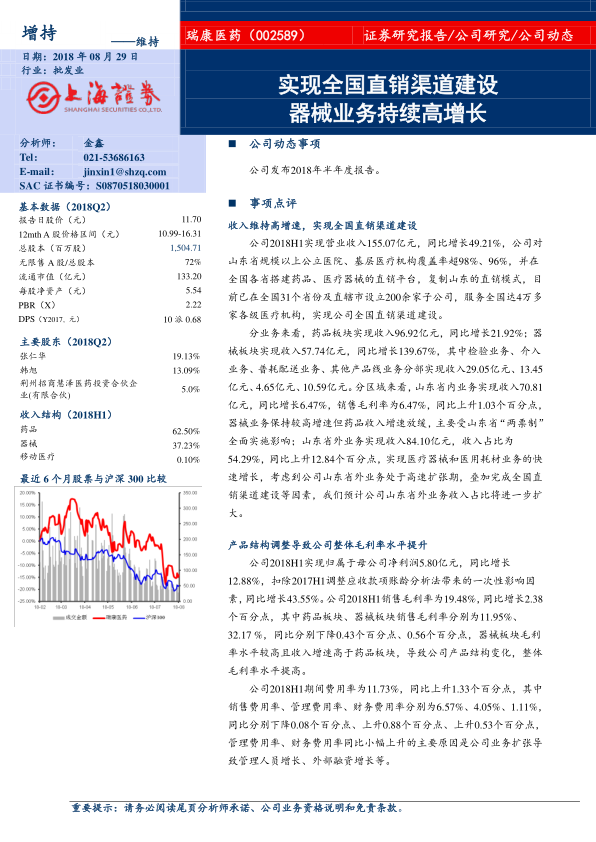 本报告分析了瑞康医药2018年半年度报告,指出公司通过全国直销渠道建设和SAP系统上线实现数字化转型,有望保持器械业务高速增长,提升运营能力和盈利能力。公司2018H1营业收入和净利润均实现显著增长,产品结构调整导致整体毛利率水平提升。报告维持对公司“增持”评级,但同时也提示了两票制推行、并购速度以及市场竞争等风险。