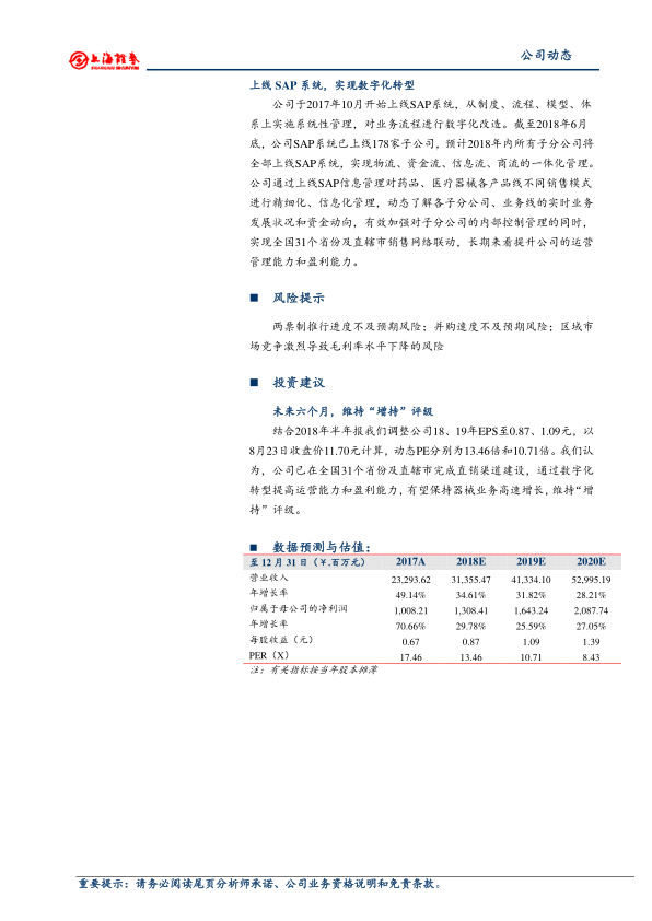 风险提示 两票制推行进度不及预期风险;并购速度不及预期风险;区域市场竞争激烈导致毛利率水平下降的风险。