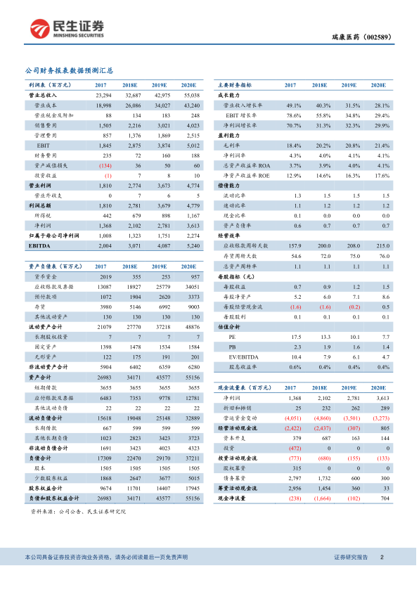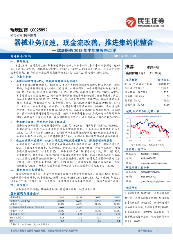 瑞康医药2018年半年度报告显示,公司业绩增长主要受益于器械业务的快速发展和全国市场的拓展。通过SAP上线和供应链金融等措施,公司在管理效率和现金流方面均有所改善。维持“推荐”评级,但需关注业务整合、政策推行和融资成本等风险因素。