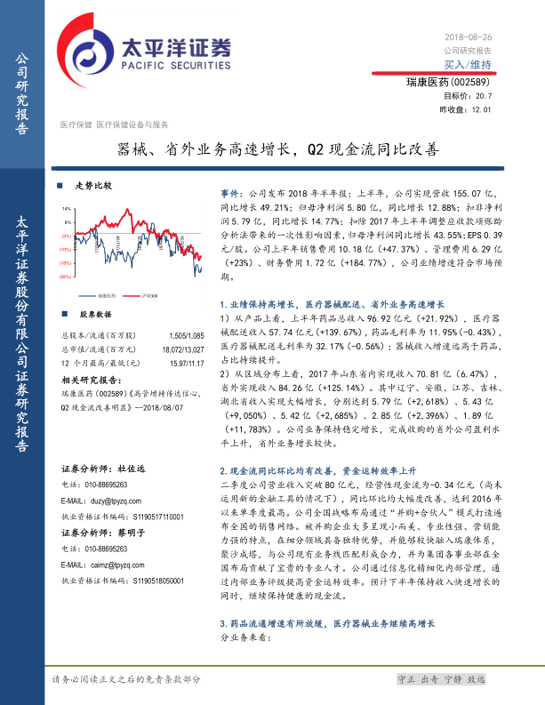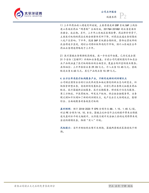 瑞康医药2018年上半年业绩表现强劲,医疗器械配送和省外业务成为增长的主要驱动力。公司通过并购和精细化管理,提升了运营效率和盈利能力。未来,随着SAP系统磨合期结束和多元化业务的拓展,公司有望保持快速增长的势头。维持“买入”评级,但需关注省外并购标的业绩不及预期和器械两票制政策推进低于预期的风险。