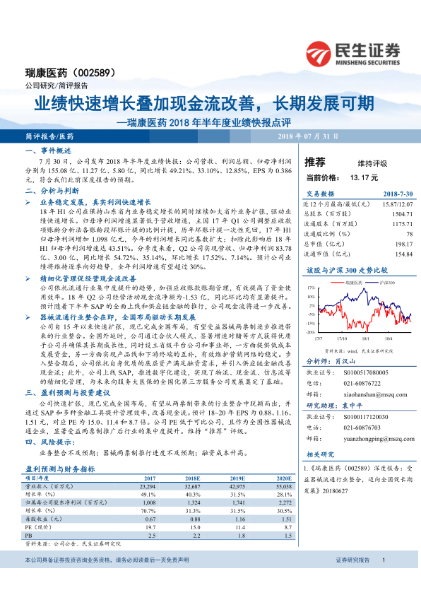瑞康医药2018年半年度业绩表现亮眼,营收和利润均实现快速增长,现金流状况有所改善。公司全国布局已基本完成,有望在器械流通行业整合中占据优势。维持“推荐”评级,但需注意业务整合、两票制推行进度以及融资成本等风险。