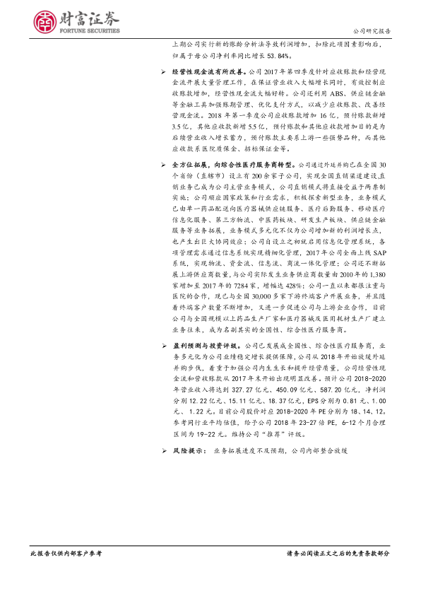 瑞康医药在2017年实现了营收和净利润的强劲增长,主要得益于药品和医疗器械配送业务的快速扩张以及新兴移动医疗服务的积极布局。公司正成功从单一药品配送商转型为全国性、综合性医疗服务商,通过外延并购构建了广泛的直销网络,并受益于“两票制”政策。尽管2018年第一季度净利润因会计调整出现短期波动,但扣除影响后仍保持高速增长,且经营性现金流和应收账款管理已显著改善。公司未来将聚焦内生增长和经营质量提升,预计2018-2020年业绩将持续稳定增长。基于其多元化业务模式和市场地位,财富证券维持其“推荐”评级,并给出19-22元的合理价格区间。
