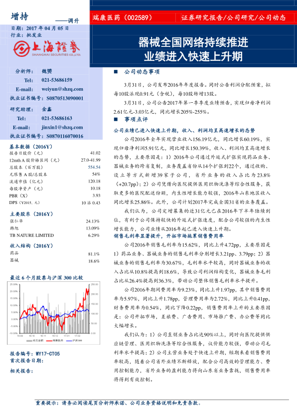 # 中心思想 * **业绩增长与扩张策略分析** * 瑞康医药业绩已进入快速上升期,主要得益于外延式扩张和内生性增长的结合。公司通过跨省复制和收购子公司,迅速扩大业务覆盖范围,同时凭借综合性服务提升医院配送份额,实现收入和利润的高速增长。 * **盈利能力提升与费用控制展望** * 公司销售毛利率显著提升,但市场开拓导致销售费用率上升。未来,随着省外业务的释放和公司高效管理,销售费用率有望得到有效控制,盈利能力将进一步提升。 # 主要内容 * **公司动态事项** * 瑞康医药发布2016年年度报告,并公告利润分配预案,拟每10股派现0.91元(含税),每10股转增13股。同时,公司发布2017年第一季度业绩预告,预计归母净利润同比增长205%-255%。 * **事项点评** * 公司2016年全年实现营业收入156.19亿元,同比增长60.19%,实现归母净利润5.91亿元,同比增长150.39%。 * 公司通过外延式扩张实现药品业务、器械业务的跨省复制,业务覆盖省份从14个扩张到22个,通过收购、设立等方式新增39家子公司,省外业务的收入占比为23.8%(+20.7pp)。 * 公司凭借向医院提供医用织物洗涤等综合性服务,获取更多的医院配送份额,内生性增长能力较强,2016年山东地区收入同比增长25.86%。 * 公司计划2017年完成全国31省的业务覆盖。 * 公司定增募集的近31亿元已在2016年下半年陆续到位,有利于公司保持较快的外延式扩张速度,配合公司较强的内生性增长能力,公司业绩从2016年起已进入快速上升期。 * **销售毛利率显著提升,开拓市场拖累销售费用率** * 公司2016年销售毛利率为15.62%,同比上升4.72pp,主要原因是药品业务、器械业务的销售毛利率分别增长3.21pp、3.79pp;器械业务的销售毛利率为30.67%,毛利率水平较高,同时器械业务的收入占比从10.8%提高到18.6%,导致公司利润结构变化,器械业务毛利占比从26.4%提高到36.3%,带动公司整体销售毛利率水平提升。 * 公司2016年期间费用率为9.23%,同比上升1.97pp,其中销售费用率为5.97%,同比上升1.78pp,管理费用率为2.72%,同比上升0.41pp,财务费用率为0.54%,同比下降0.22pp,销售费用率上升的主要原因是:公司开拓市场,差旅费、广告费用、市场推广费、办公费等同比大幅增长。 * 公司直销业务占比达90%以上,同时向医院提供供应链管理、医用织物洗涤等综合性服务,议价能力较强,带动公司毛利率水平提高。 * 公司主营业务处于快速上升期,短期来看销售费用率较高,随着公司省外业绩不断释放,配合公司高效的管理能力、费用控制能力,省外业务的盈利能力将向山东省业务靠拢,销售费用率将得到有效控制。 * **药品业务增长稳健,器械业务依赖外延式扩张呈爆发式增长** * 公司药品业务2016年营业收入为126.68亿元,同比增长46.10%,销售毛利率为12.18%(+3.21pp),2016年公司药品业务走出山东,实现了跨省复制,控股收购6个省份的药品配送公司。 * 公司器械业务2016年营业收入为28.99亿元,同比上升175.97%,销售毛利率为30.67%(+3.79pp),业务覆盖全国20多个省份,构建起覆盖全国的医疗器械配送平台,在检验、介入、骨科等10个事业部的基础上,新增康复等3个事业部。 * 公司2015年做出了三年完成全国31个省份设立控股公司、完成全国市场覆盖的战略计划,依赖资本优势,通过控股收购的方式对区域市场中规模较大、盈利能力较强的优质标的公司进行整合,预计17、18年公司业绩将维持快速增长的态势。 * **风险提示** * 两票制推行进度不及预期风险;并购速度不及预期风险;两票制等行业政策导致毛利率水平下降的风险 * **投资建议** * 预计公司2017年、2018年的EPS分别为1.47元、2.18元,以3月31日收盘价41.02元计算,对应的动态市盈率分别为27.8倍、18.8倍。同行业可比上市公司17年、18年动态市盈率的中值分别为28.9倍、22.7倍,公司估值水平低于同行业可比上市公司的中值。 * 公司内生性增长保持20%以上,同时业务覆盖范围2017年计划从全国22个省份扩张到31个,有望实现器械业务全国销售网络布局,业绩进入快速上升期;公司定增募集的近31亿元已在2016年下半年陆续到位,增强公司资本实力,有利于公司保持较快的外延式扩张速度。公司本身是山东区域的药品流通龙头,具有丰富的药品、器械配送经验,公司已进入业绩快速上升期,16-18年器械业务保持较快的外延式扩张速度,带动公司整体业绩保持高速增长,调升“增持”评级。 # 总结 * **核心增长动力与未来展望** * 瑞康医药通过外延并购和内生增长双轮驱动,实现了业绩的快速增长。器械业务的扩张和盈利能力的提升是公司增长的重要动力。 * **投资评级与估值分析** * 考虑到公司未来的扩张计划和盈利能力提升的潜力,以及当前估值低于同行业平均水平,分析师调升瑞康医药至“增持”评级,显示出对公司未来发展的信心。