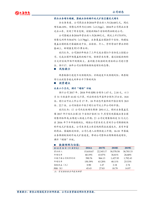 • 公司内生性增长保持20%以上,同时业务覆盖范围2017年计划从全国22个省份扩张到31个,有望实现器械业务全国销售网络布局,业绩进入快速上升期;公司定增募集的近31亿元已在2016年下半年陆续到位,增强公司资本实力,有利于公司保持较快的外延式扩张速度。公司本身是山东区域的药品流通龙头,具有丰富的药品、器械配送经验,公司已进入业绩快速上升期,16-18年器械业务保持较快的外延式扩张速度,带动公司整体业绩保持高速增长,调升“增持”评级。