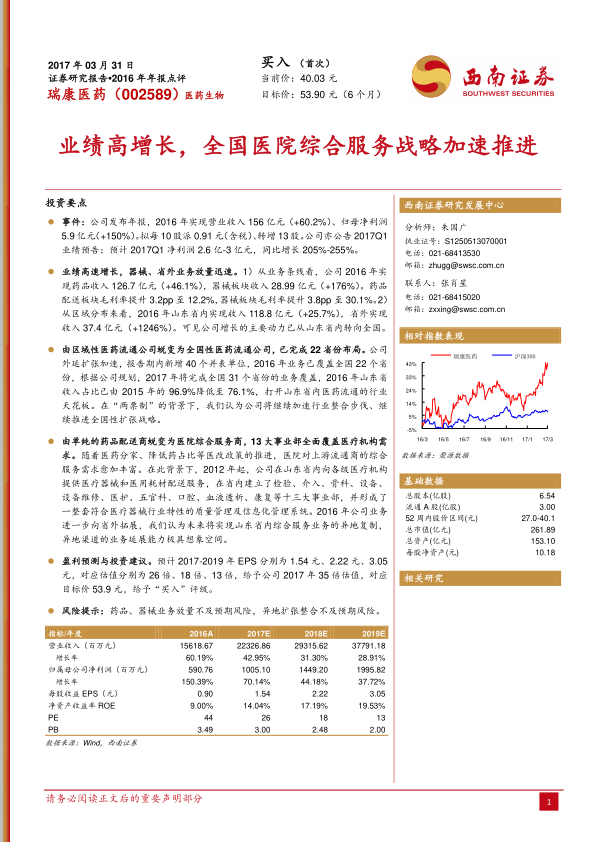 本报告对瑞康医药2016年年报进行了全面分析,指出公司业绩高速增长,全国医院综合服务战略加速推进。公司通过外延扩张和业务转型,实现了从区域性医药流通公司向全国性医院综合服务商的转变。报告同时提示了公司面临的风险,并给出了投资建议。