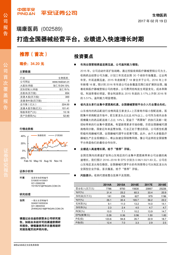 基于公司业绩的快速增长和未来发展潜力,报告首次覆盖给予瑞康医药“推荐”评级,并预测了未来几年的EPS。但同时提示了收购代理商整合效果不及预期的风险。