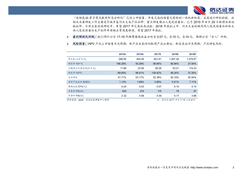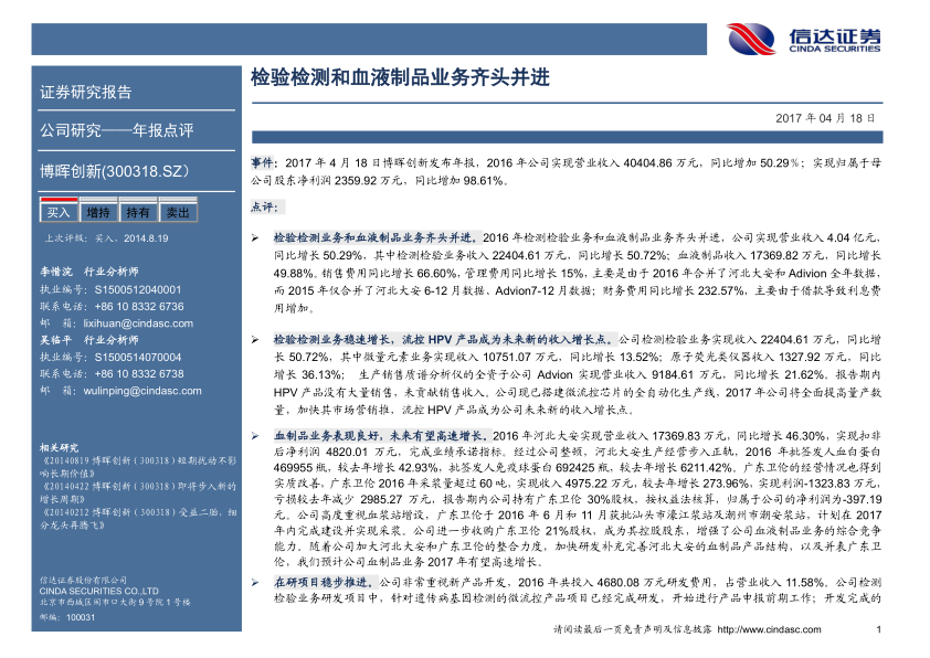 本报告对博晖创新2016年年报进行了深入分析,指出公司检验检测和血液制品业务双轮驱动,业绩增长显著。公司在HPV产品、血浆站建设和新产品研发等方面积极布局,为未来的高速增长奠定基础。维持公司“买入”评级,但同时也提示了HPV产品上市销售不达预期、新产品未能顺利取得产品注册证、新设浆站不及预期以及产品研发风险等风险因素。
