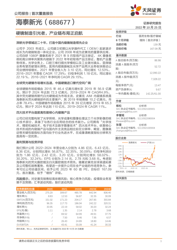 我们预计公司2022-2024年营业收入分别为4.86亿元、6.43亿元、8.36亿元,分别同比增长56.87%、32.35%、30.09%;归母净利润分别为1.86亿元、2.42亿元、3.20亿元,分别同比增长58.02%、30.20%、32.24%;EPS分别为2.14元、2.78元和3.68元。考虑到海泰新光的荧光腹腔镜及白光腹腔镜技术领先,随着史赛克全球渠道拓展及公司整机销售蓄势,有望进一步提升公司在全产业链的市场竞争力。参考可比公司估值区间,给予公司2023年60倍PE,目标价167.09元,首次覆盖,给予“增持”评级。