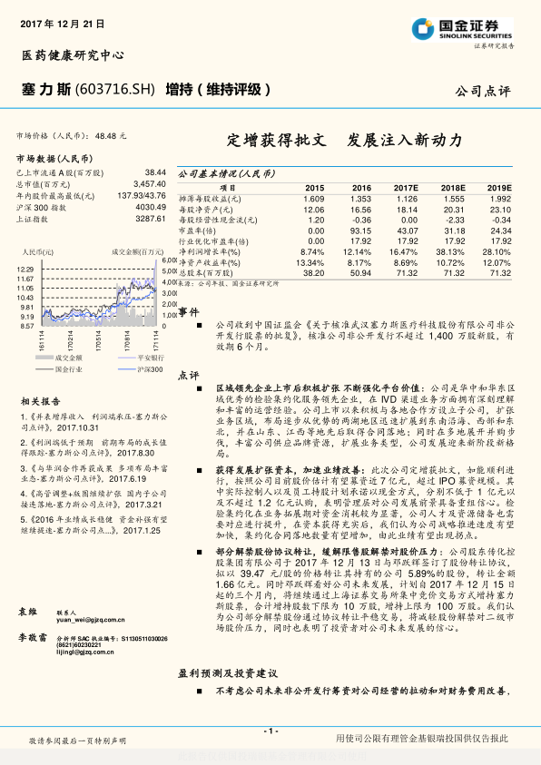 公司股东传化控股集团有限公司于 2017 年 12 月 13 日与邓跃辉签订了股份转让协议,拟以 39.47 元/股的价格转让其持有的公司 5.89%的股份,转让金额 1.66亿元。同时邓跃辉看好公司未来发展,计划自 2017 年 12 月 15 日起的三个月内,将继续通过上海证券交易所集中竞价交易方式增持塞力斯股票,合计增持股数下限为 10 万股, 增持上限为 100 万股。我们认为公司部分解禁股份通过协议转让平稳交易,将减轻股份解禁对二级市场股价压力,同时也表明了投资者对公司未来发展的信心。