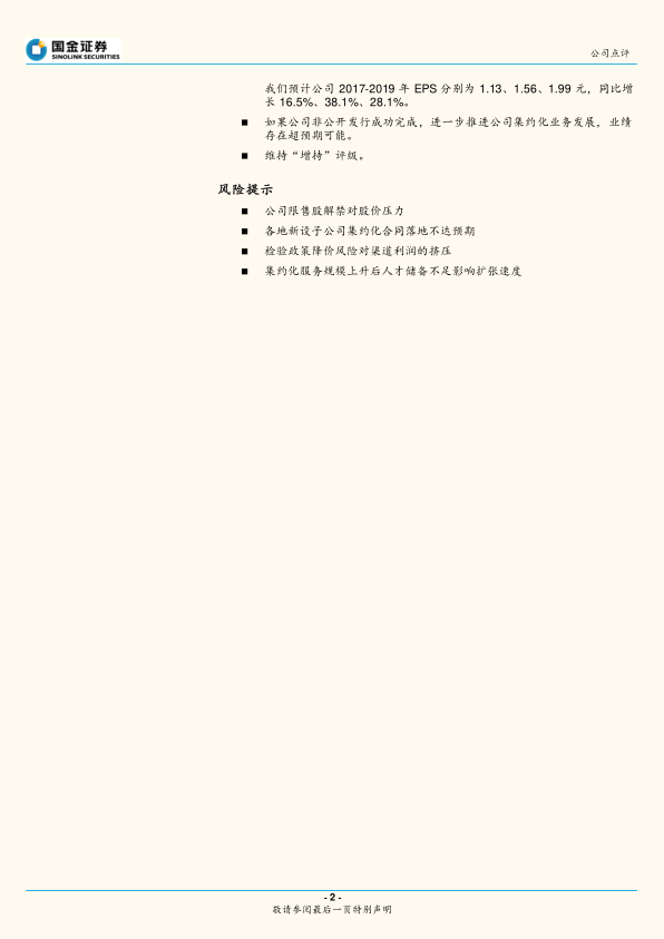 不考虑公司未来非公开发行筹资对公司经营的拉动和对财务费用改善,我们预计公司 2017-2019 年 EPS 分别为 1.13、1.56、1.99 元,同比增长 16.5%、38.1%、28.1%。如果公司非公开发行成功完成,进一步推进公司集约化业务发展,业绩存在超预期可能。维持“增持”评级。