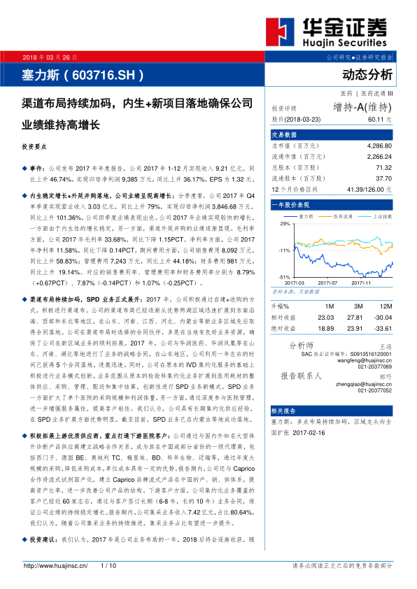 塞力斯在2017年通过内生增长和外延并购实现了营业收入和归母净利润的显著提升,尤其第四季度业绩表现强劲。公司积极推进全国渠道布局,将业务范围扩展至多个新区域,并通过创新性的SPD业务模式,深化了与医院客户的合作,提升了服务价值和客户粘性。在上游,公司与国内外知名供应商建立战略合作,确保了成本优势和产品供应;在下游,通过长期集采合同锁定了稳定客户群,集采业务收入占比已超过80%。定增方案的获批将为公司未来的战略扩张提供资金保障。分析师对公司未来业绩持乐观态度,预计集采业务将保持高速增长,并维持“增持-A”的投资评级。然而,公司仍需关注渠道扩张不及预期、市场竞争加剧以及政策变化等潜在风险。