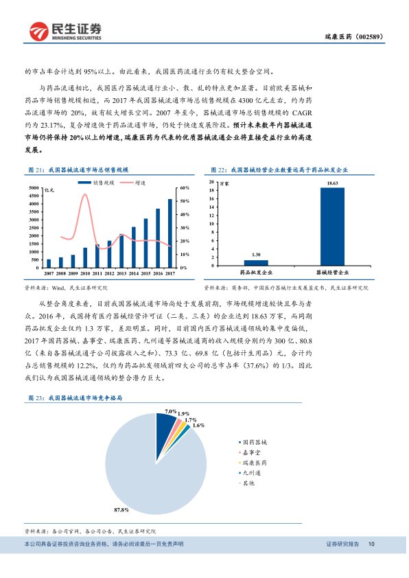 1. 药品与器械两票制推动行业集中度提升 我国药品流通市场规模庞大,2017年超过2万亿元,但行业集中度仍较低,前三大商业公司市占率不足40%,远低于美国95%以上的水平,预示着巨大的整合空间。医疗器械流通市场更为分散,2017年总销售规模约4300亿元,约为药品市场的20%,但CAGR达23.17%,增速快于药品。2016年我国医疗器械经营企业数量高达18.63万家,远超药品批发企业(约1.3万家),市场集中度极低,前四大器械流通商合计市占率仅约12.2%。
