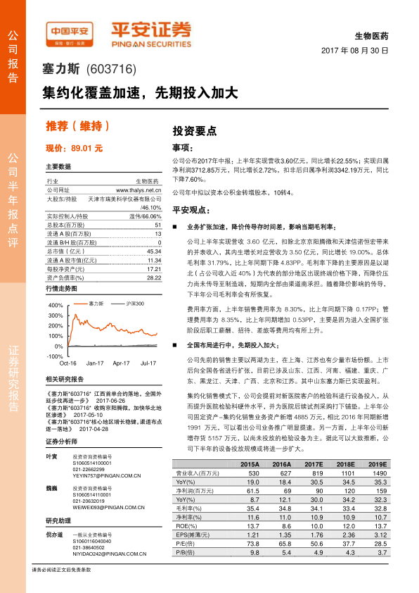 塞力斯2017年中报显示公司业务扩张加速,但受降价因素影响,短期毛利率有所下降。公司正积极进行全国集约化布局,先期投入加大,预计未来将带来更多订单。平安证券维持对公司“推荐”评级,看好其在IVD集约供应领域的龙头地位和全国市场扩张前景,但同时也提示了渠道扩张不及预期和政策风险。
