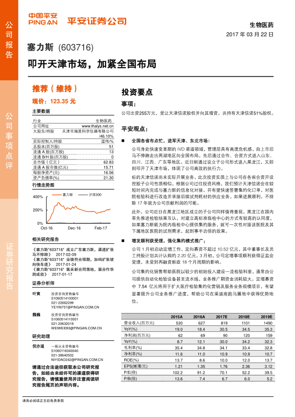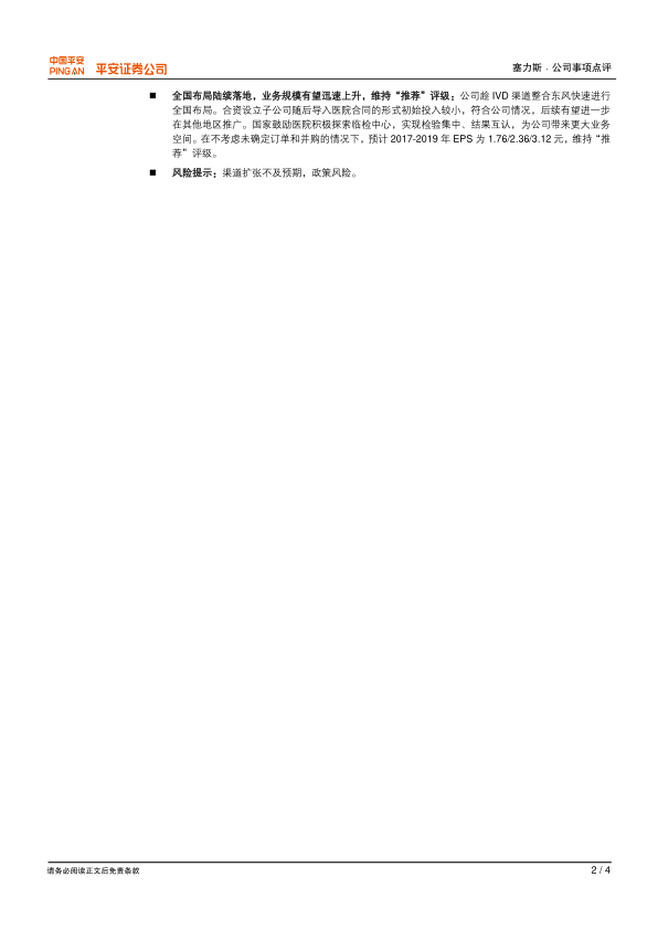 塞力斯正处于快速变革的IVD渠道领域,管理层具有高度危机感,积极进行全国布局。通过投资天津信诺和设立黑龙江子公司,公司进一步拓展了市场范围。定增募资的顺利受理将有助于公司扩大集约化销售模式,提升业务推广速度。在国家鼓励临检中心建设的背景下,塞力斯有望迎来更大的发展机遇。维持“推荐”评级,但需注意渠道扩张不及预期和政策风险。
