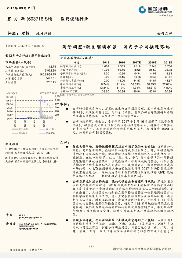 本报告对塞力斯(603716.SH)进行了深度分析,认为公司正受益于体外诊断流通领域整合的行业趋势,通过积极的异地扩张战略,有望实现业务模式的复制和业绩的快速增长。维持“增持”评级,但提醒投资者关注业务扩张、集约化服务、资金、市场竞争和政策等风险。