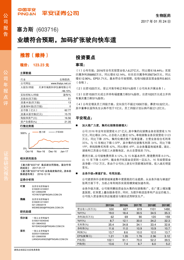 塞力斯2016年业绩符合预期,集约化销售模式效果显著,公司正加速在体外诊断(IVD)领域进行业务升级和渠道扩张,并迅速启动定增和员工持股计划,彰显了公司对未来发展的信心。