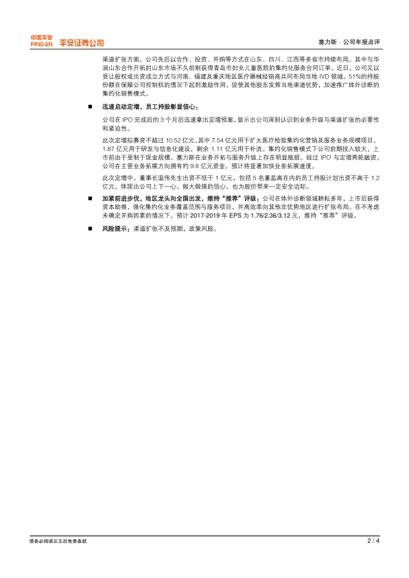 报告维持对塞力斯的“推荐”评级,认为公司在体外诊断领域深耕多年,上市后借助资本力量,有望实现业务范围和服务项目的扩张,并高效地向非优势地区进行布局。