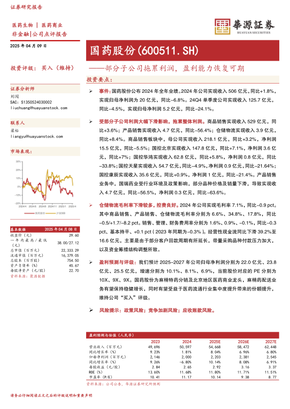 国药股份2024年业绩表现为收入小幅增长但归母净利润同比下降6.8%,主要受部分子公司利润大幅下滑及仓储物流毛利率下降拖累。尽管公司在费用控制方面表现良好,但经营性现金流因回款周期延长和带量采购压力而显著下滑。展望未来,鉴于公司在麻精特药分销和北京地区医药商业的龙头地位,以及医药流通行业集中度提升的趋势,预计其盈利能力将逐步恢复。华源证券维持“买入”评级,并预测2025-2027年归母净利润将实现稳健增长,但投资者仍需关注政策、竞争加剧及应收账款等潜在风险。