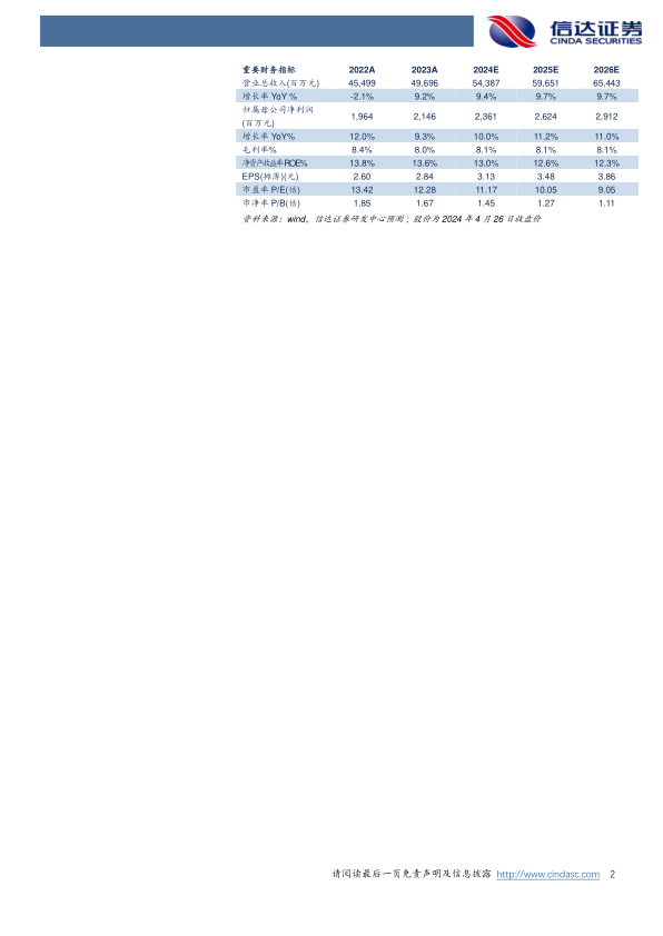 预计公司2024-2026年营业收入分别为543.87亿元、596.51亿元、654.43亿元,同比增速分别为9%、10%、10%,归母净利润为23.61亿元、26.24亿元、29.12亿元,同比分别增长10%、11%、11%,对应当前股价的PE分别为11倍、10倍、9倍。