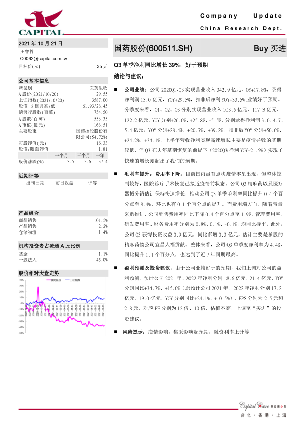本报告的核心在于分析国药股份(600511.SH)在2021年Q3的业绩表现,并基于此调整盈利预测和投资建议。