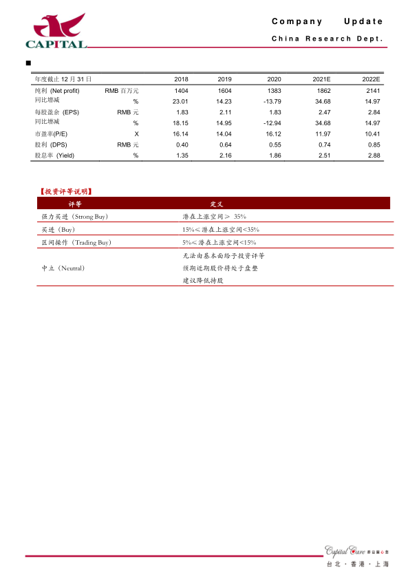 盈利预测及投资建议:由于公司业绩好于的预期,我们上调对公司的盈利预测。预计公司2021年、2022年净利分别18.6亿元、21.4亿元,YOY分别同比+34.7%、+15.0%(原预计公司2021年、2022年净利分别17.2亿元、19.0亿元,YOY分别同比+24.1%、+10.5%),EPS分别为2.5元和2.8元,对应PE分别为12倍、10倍,估值不高,上调至“买进”的投资建议。