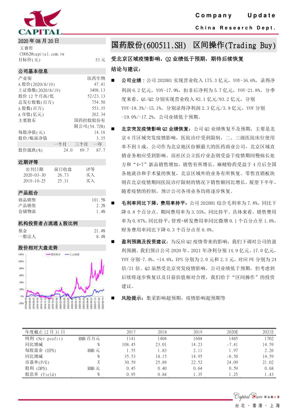 本报告对国药股份2020年上半年的业绩进行了分析,指出公司业绩受到北京区域疫情的影响,低于预期。但随着疫情的控制,预计公司各项业务将逐步恢复。报告下调了对公司的盈利预测,但考虑到公司估值相对合理,维持“区间操作”的投资建议。同时,报告也提示了集采和疫情等风险因素。总体而言,国药股份短期业绩承压,但长期发展趋势向好,具有一定的投资价值。
