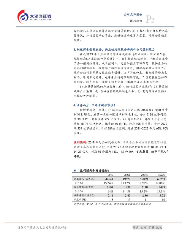 综合上述估值,预计国药股份2020年合计市值空间可达334亿元,相较当前市值存在约38%的增长空间。展望未来,报告预测2021年和2022年,公司市值空间将分别有约62%和90%的增长潜力,显示出显著的投资价值。