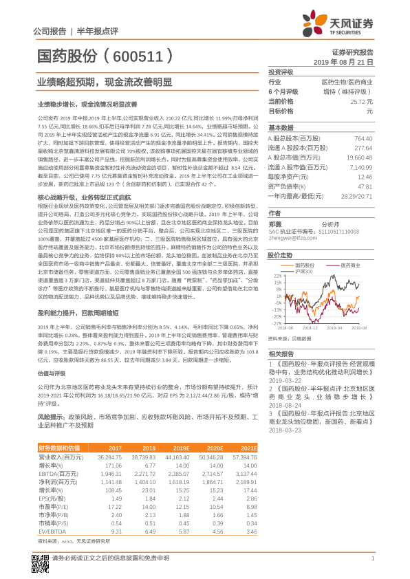 国药股份2019年上半年业绩表现稳健,营收和利润均实现增长,现金流状况显著改善。公司通过战略升级和业务转型,巩固了在北京地区的龙头地位,并在特色业务和零售渠道方面取得了显著进展。盈利能力提升和回款周期缩短进一步增强了公司的财务健康。维持“增持”评级,但需关注政策风险、市场竞争和应收账款等潜在风险。