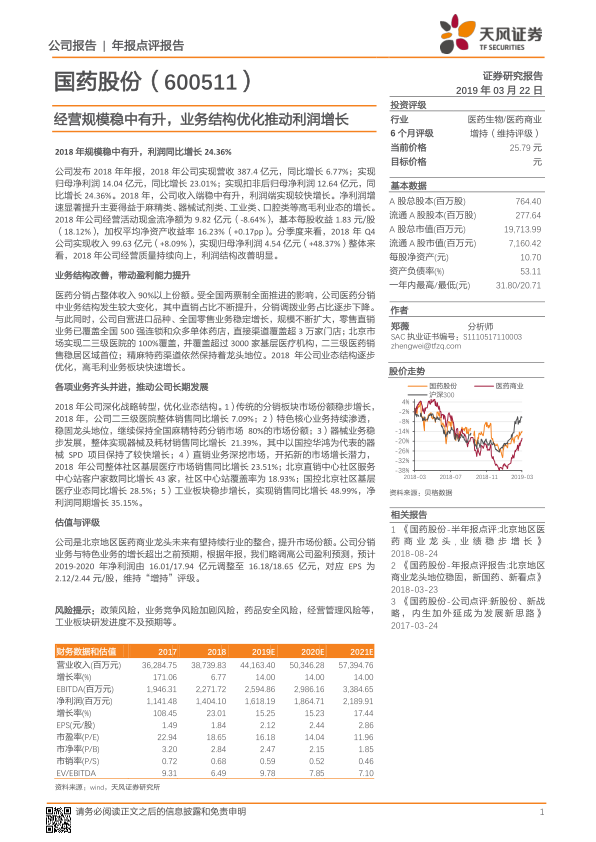 本报告对国药股份2018年年报进行了全面分析,公司在2018年实现了营收和利润的稳健增长,业务结构持续优化,盈利能力显著提升。各项业务齐头并进,为公司的长期发展奠定了坚实基础。考虑到公司良好的发展态势和未来的增长潜力,维持“增持”评级。同时,报告也提示了投资者需要关注的各项风险。