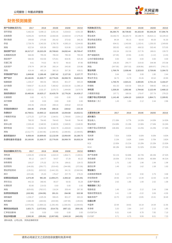 考虑到公司分销业务与特色业务的增长超出预期,根据年报,略调高公司盈利预测,预计 2019-2020 年净利润由 16.01/17.94 亿元调整至 16.18/18.65 亿元,对应 EPS 为 2.12/2.44元/股,维持“增持”评级。
