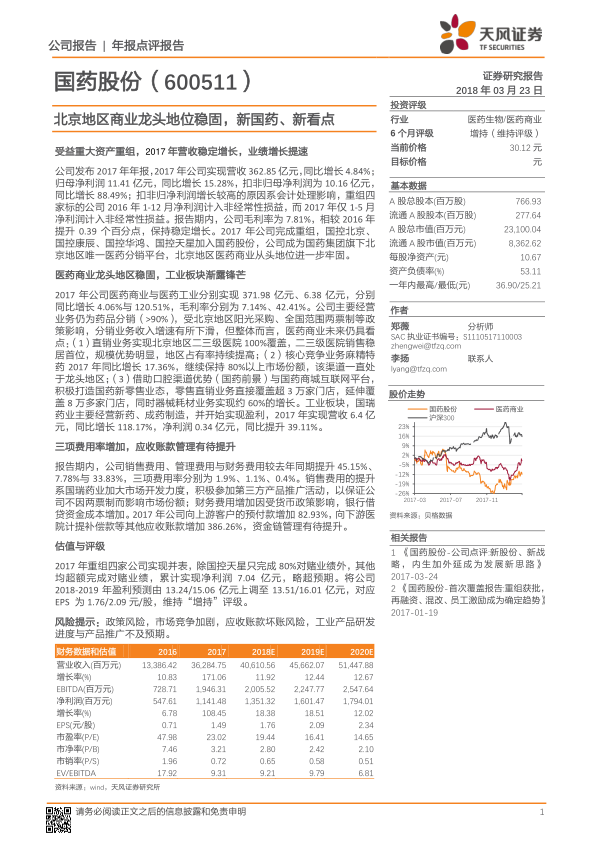 国药股份通过重大资产重组,巩固了其在北京地区的医药商业龙头地位。公司2017年营收稳定增长,业绩增长提速,医药商业与工业板块均有亮点。公司在医药商业领域,直销业务和麻精特药业务保持领先,同时积极拓展新零售业态。工业板块的国瑞药业也开始实现盈利。但同时,公司也面临三项费用率增加和应收账款管理等问题。天风证券维持对公司“增持”评级,并上调了公司2018-2019年的盈利预测。