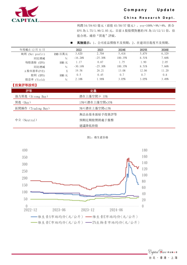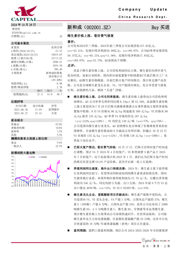 受益于维生素价格上涨,公司营收利润同比大增。维生素经历两年景气低谷时段,迎来行业转折。国内供应商装置集中检修叠加7月底巴斯夫工厂火灾催化,Q3维生素价格跳涨。目前巴斯夫复产时间推迟,预计将支撑产品价格。公司是全球维生素龙头企业,VA、VE产能国内领先,充分享受景气修复红利,业绩弹性凸显,维持“买进”评级。