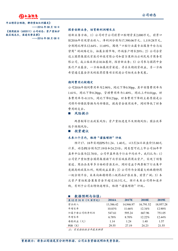 本报告分析了国药股份2016年业绩及未来发展前景。公司业绩稳健增长,但受工业业务下滑影响,利润增速略低于收入增速。重大资产重组是公司未来发展的关键驱动力,将解决同业竞争问题,整合资源,为公司平台化发展奠定基础。公司积极探索创新业务,培育新的利润增长点。维持“谨慎增持”评级,但需关注行业政策风险和重组进度风险。