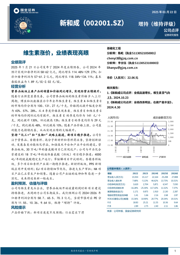 公司为维生素龙头企业,营养品板块开始放量的同时新项目建设持续推进,共同助力公司长期成长。我们预测公司2024-2026年归母净利润分别为58.7、65.5、70.3亿元,当前市值对应PE分别为11.55、10.36、9.64倍,维持“增持”评级。