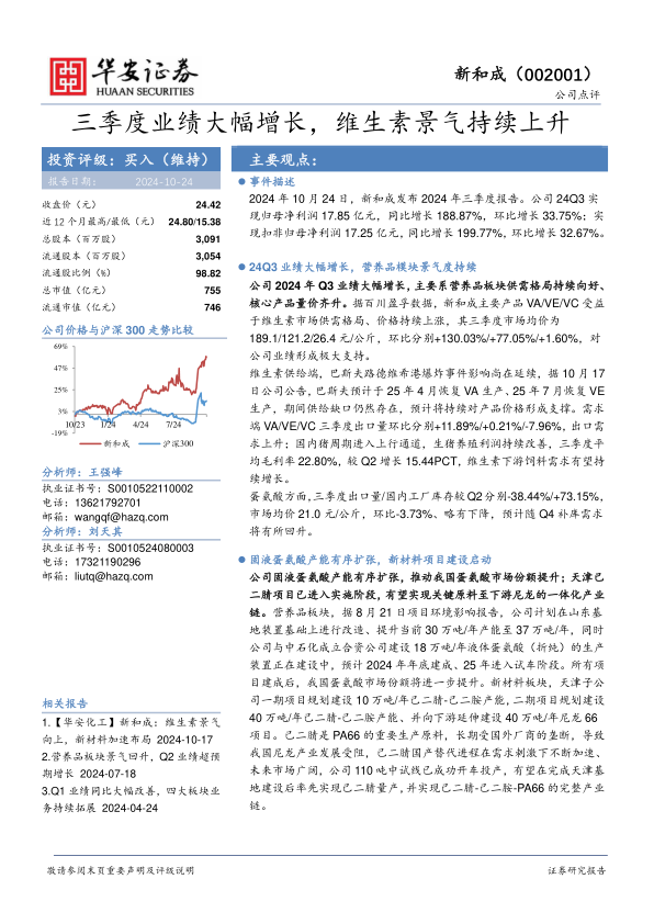 新和成在2024年第三季度展现出卓越的财务表现,归母净利润同比大幅增长188.87%,主要得益于维生素市场持续的景气度以及核心产品VA、VE、VC的量价齐升。巴斯夫工厂的生产中断进一步加剧了供给紧张,而国内生猪养殖利润的改善则提振了下游饲料需求,共同支撑了维生素价格。在蛋氨酸业务方面,公司正积极推进产能扩张,旨在提升市场份额。更具战略意义的是,新和成在新材料领域取得了突破,天津己二腈项目有望打破国外垄断,实现己二腈-己二胺-PA66的完整产业链,为公司开辟新的增长极。鉴于公司强劲的业绩增长、清晰的产能扩张计划和在新材料领域的战略布局,华安证券维持“买入”评级,并对未来三年盈利能力持乐观预期,但同时提示了宏观经济、原材料价格波动、产能建设及汇率贸易等潜在风险。