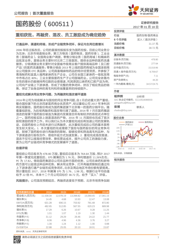 国药股份通过成功的重大资产重组,不仅彻底解决了同业竞争问题,巩固了其在北京地区医药分销市场的领导地位,更通过整合优质资产,预计在2017年实现净利润翻倍增长。此次重组为公司后续的再融资和混合所有制改革扫清了障碍,使其能够借助外部资本加速发展,投资高毛利品种,并与下游渠道进行股权合作。公司凭借在麻醉药品和口腔产品等领域的产业链闭环竞争优势,以及作为国药集团混改试点单位的先行者,未来有望通过提升经营效率、强化员工激励,并拓展京津冀及环渤海地区市场,实现持续的内生性增长和战略扩张。鉴于其明确的增长路径和改革红利,报告给予“买入”评级,目标价38.72元。然而,投资者仍需关注混改预期延后、再融资进度低于预期以及北京市场竞争加剧等风险。