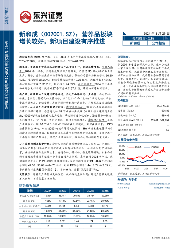 公司盈利预测及投资评级:新和成是国内优质的精细化工合成龙头,产业链一体化和产品系列化推动公司逐渐成长为精细化工龙头。公司从医药中间体起家,成功将业务拓展到维生素、香精香料、新材料、蛋氨酸等领域。未来公司新项目的逐步建设有望进一步丰富公司产品体系。基于公司2024年中报,我们相应调整公司2024~2026年盈利预测。我们预测公司2024~2026年净利润分别为44.36、53.68和64.70亿元,对应EPS分别为1.44、1.74和2.09元,当前股价对应P/E值分别为13、11和9倍。维持“强烈推荐”评级。