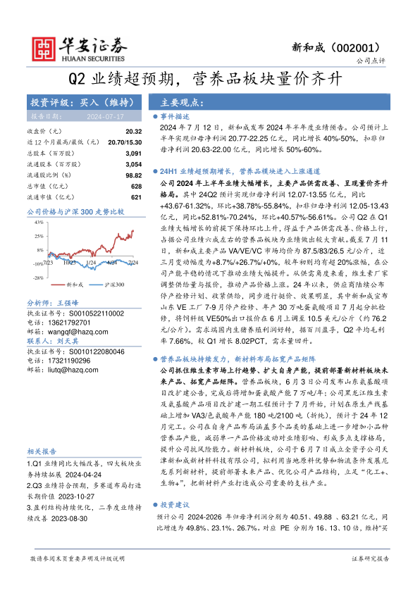 公司2024年上半年业绩大幅增长,主要产品供需改善、呈现量价齐升格局。其中24Q2预计实现归母净利润12.07-13.55亿元,同比+43.67-61.32%,环比+38.78%-55.84%,扣非归母净利润12.05-13.43亿元,同比+52.81%-70.24%,环比+40.57%-56.61%。公司Q2在Q1业绩大幅增长的前提下保持环比上升,得益于产品供需改善、价格上行,占据公司业绩六成左右的营养品板块为业绩做出较大贡献。截至7月11日,新和成主要产品VA/VE/VC市场均价为87.5/83/26.5元/公斤,近三月变动幅度为+8.7%/+26.7%/+0%,较年初则均有超20%涨幅,在公司产能平稳的情况下推动业绩大幅提升。从供需角度来看,维生素厂家调整供给量与报价,推动产品价格上涨。24年以来,供应商陆续公布停产检修计划、收紧供给,同步进行挺价、效果明显,其中新和成宣布山东VE工厂7-9月停产检修、年产30万吨蛋氨酸项目7月起分批检修,将饲料级VE50%出口报价在6月上调至10.5美元/公斤(约76.2元/公斤)。需求端国内生猪养殖利润好转,据百川盈孚,Q2平均毛利率7.66%,较Q1增长8.02PCT,需求量回升。