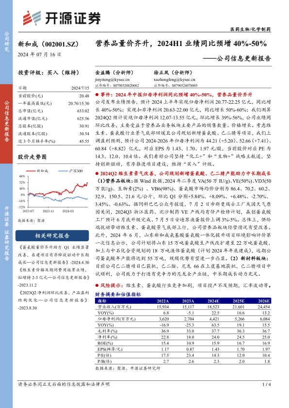 公司发布业绩预告,预计2024上半年实现归母净利润20.77-22.25亿元,同比增长40%-50%;实现扣非净利润20.63-22.00亿元,同比增长50%-60%;我们测算2024Q2预计实现归母净利润12.07-13.55亿元,环比增长39%-56%,公司业绩同环比改善,主要受益于营养品业务板块主要产品的销售数量、价格增长。考虑维生素、蛋氨酸行业景气底部回暖且公司规划新增蛋氨酸、己二腈等项目,我们上调盈利预测,预计公司2024-2026年归母净利润为44.21(+5.20)、52.66(+7.41)、60.84(+8.82)亿元,对应EPS为1.43、1.70、1.97元/股,当前股价对应PE为14.3、12.0、10.4倍。我们看好公司坚持“化工+”和“生物+”战略主航道,坚持创新驱动,有序推进项目建设,维持“买入”评级。