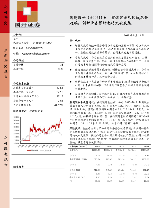基于北京新一轮阳光采购、调拨业务控制、麻精药业务加速增长以及投资收益稳定等假设,预计重组前公司2017-2019年归母净利润分别为6.15亿、7.05亿和8.12亿元。若按承诺利润计算,重组后新国药2017-2019年归母净利润将分别达到11.7亿、13.4亿和15.3亿元,对应EPS分别为1.54、1.75和2.01元/股。按2017年5月10日收盘价计算,重组完成后公司市值约264亿元,对应2017-2019年动态市盈率分别为22.5、19.8、17.2倍。与申万医药商业板块TTM估值27.8倍及可比公司相比,公司估值处于行业偏低水平,具备一定优势。