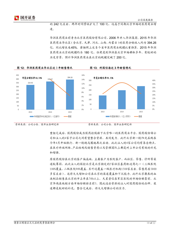 国药股份即将完成的重大资产重组和再融资是公司发展的里程碑事件,旨在解决同业竞争问题,并将公司打造为国药集团旗下在北京地区唯一的医药商业分销平台。重组完成后,公司在北京的医药商业业务规模预计将突破250亿元,市场份额显著提升,有望成为北京医药商业的龙头企业之一,并在新一轮阳光采购和“两票制”政策下获得更大的市场份额提升空间。