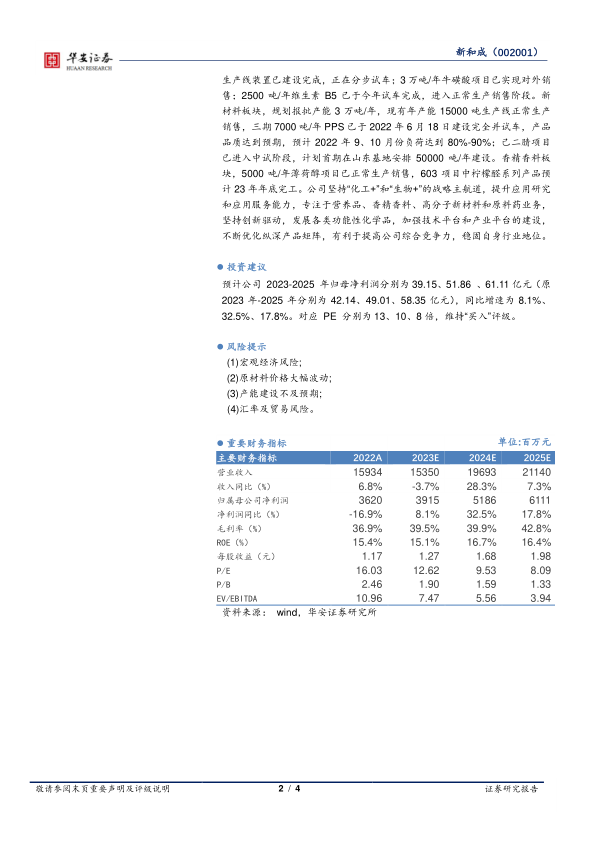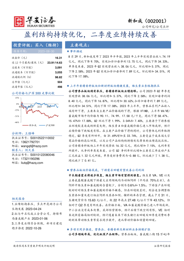 新和成在2023年上半年面临维生素业务的短期压力,但通过优化盈利结构、稳健发展香精香料和新材料板块,以及成本控制,实现了二季度业绩的环比改善。随着维生素市场价格筑底和下游需求回暖,公司利润有望得到改善。同时,公司多项目同步推进,持续扩张业务,提升综合竞争力。维持“买入”评级。