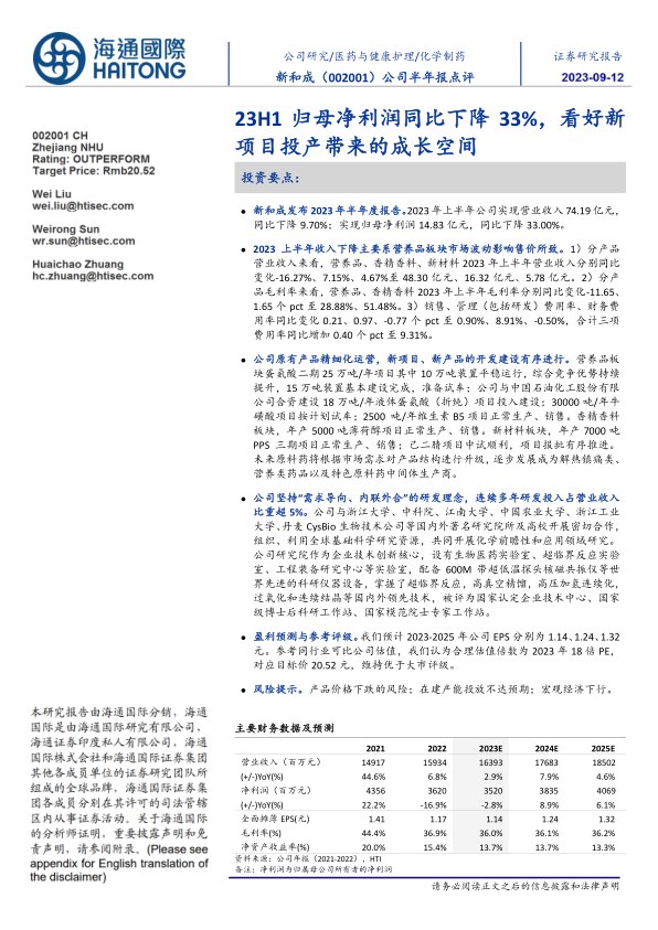 本报告对新和成(002001)2023年半年度报告进行了分析,核心观点如下: